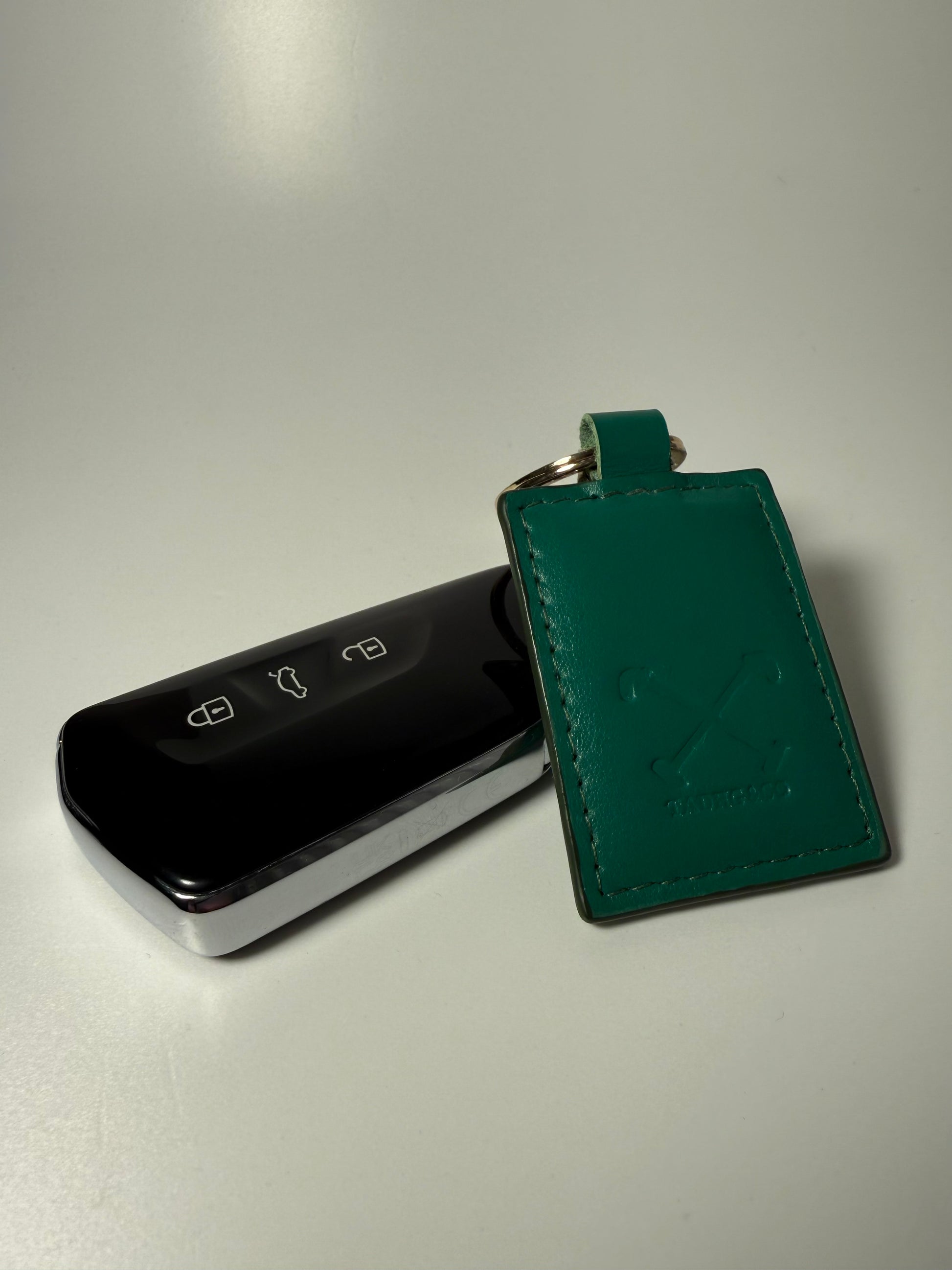 Handcrafted British racing green leather key ring in premium full-grain Italian leather. UK-made luxury country accessory with timeless style and quality craftsmanship featuring our unique polo mallet logo.